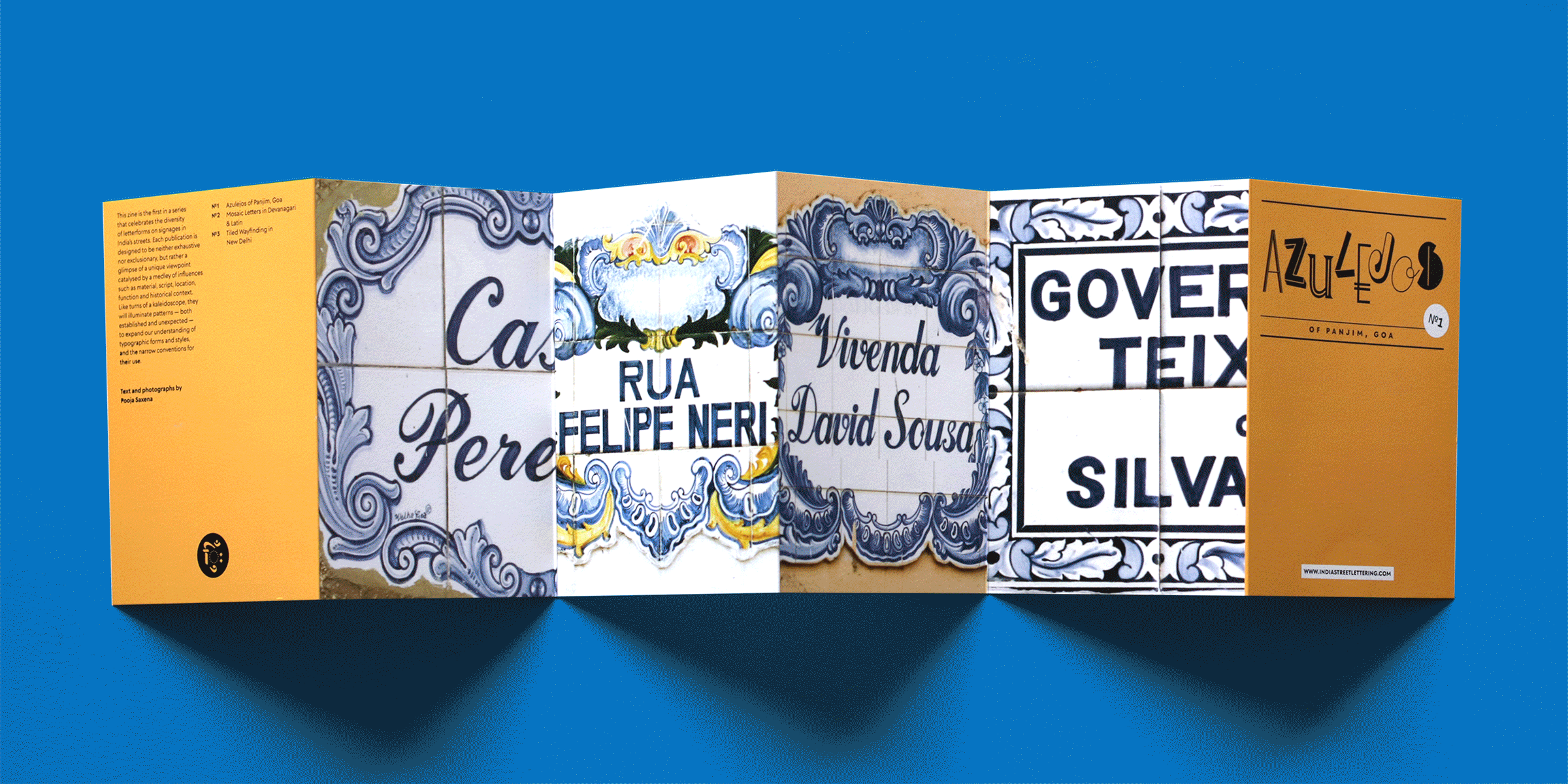 This bundle of zines recognises three such themes — azulejos, or hand-painted, glazed tiles seen in Panjim which are striking visual reminders of Portuguese influence in Goa; fast-disappearing tiled signage in New Delhi, which is distinctive in its use of monospaced letterforms in two scripts; and mosaic signs, which are a provocation to appreciate and understand how vastly different letterforms from Devanagari and Latin scripts adapt when they are rendered in a limiting medium.